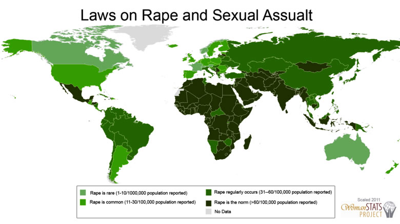 “The Woman Stats Project”, tomamos la siguiente imagen sobre un mapa con la proporción de violaciones y asaltos sexuales en el mundo: